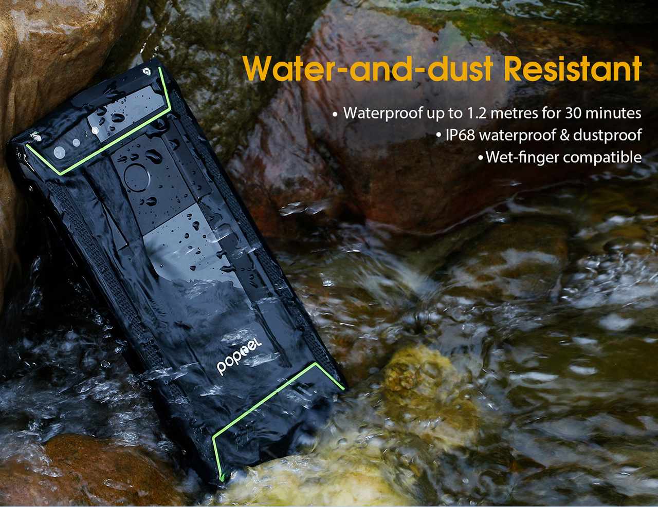 The Poptel P60 is an outdoor smartphone designed for rugged use, certified with MIL-SPEC 810G for added resilience. It can withstand submersion in water up to 1.2 meters for 30 minutes, and the display remains responsive even with wet fingers. The 5.7-inch screen delivers clear visuals, powered by a Helio P23 Octa-Core processor running at 2GHz. Its 5000mAh battery provides substantial power for extended use, while Android 8.1 ensures a straightforward user experience.